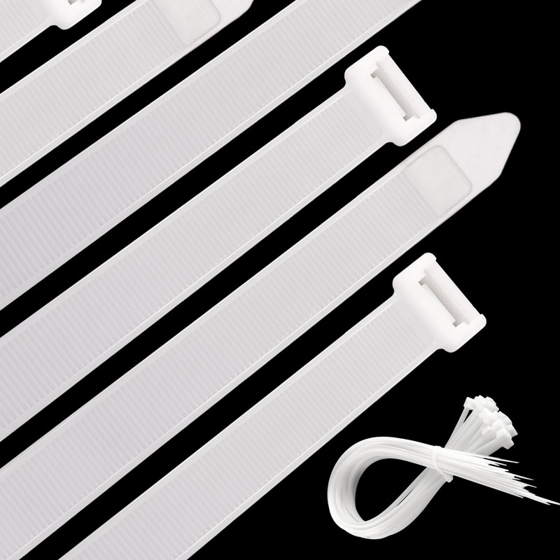 - (Durable) White Cable Ties - Pack of 10, L: 31.5 inches (800 mm), W: 1.0 inches (25 mm), T: 0.1 inches (2 mm), PP Plastic Material, Quality: PA66. Width and thickness determines strength. Not only are our liners the widest widths, but the thickest (2mm), most neckties on the market are only 1.2mm. Same size but suitable for more projects. 264.2 lbs (120 kg) tensile strength can handle your most difficult jobs