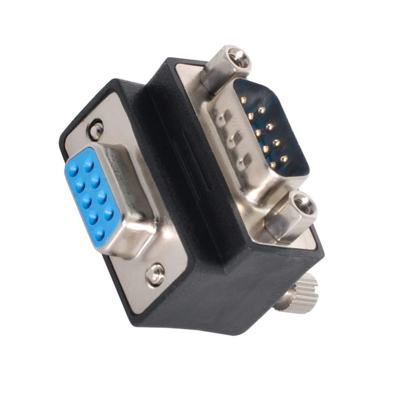 - Ein links abgewinkelter 9-poliger DSUB-Stecker-Buchsen-Adapter. Die Buchse ist mit Rändelschrauben ausgestattet, der Stecker ist mit Schraubenmuttern versehen. 9-poliger Stecker-Buchsen-Adapter mit Dichte. Zwei Reihenkontakte, 90-Grad-Winkeladapter.