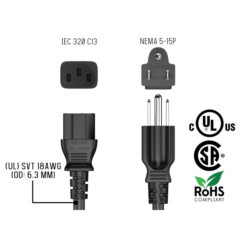 - UNIVERSAL COMPATIBILITY: This IEC-60320-C13 to NEMA 5-15P power cable works seamlessly with various devices equipped with an IEC-60320-C14 inlet, such as PC monitors, desktop computers, laptops, printers, scanners, TVs, and audio systems.