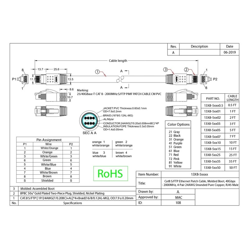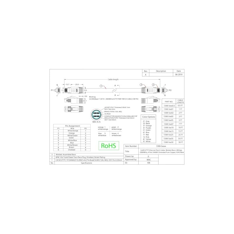 - UNIVERSAL COMPLIANCE WITH WIDE COLOR RANGE: Category 8.1 cable, Class I channel, features a black PVC jacket, braided outer shield, with four individually mylar foil shielded 24 AWG pure copper pairs as defined in ISO/IEC 11801 and ratified in ANSI/TIA 568-C.2-1. It is available in a wide variety of colors for proper color coding.