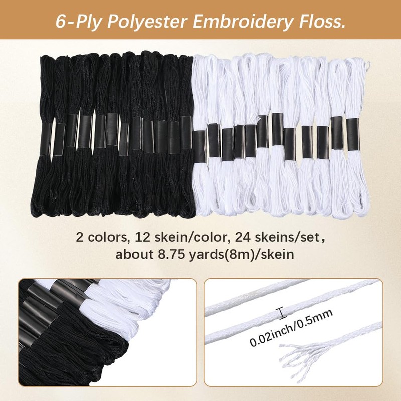 - Embroidery Thread Black and White: 12 skeins each of black and white embroidery floss, in a basic color palette suitable for most embroidery themes