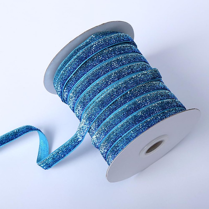 CABODYALS 50 Yards 3/8 Inch Blue Sequin Trim Metallic Glitter Velvet Ribbon Single Face Gradient Thin Fabric Ribbons Bundle Rolls with Spool for Crafts Christmas Bouquet Sewing Party Decor Diy Project