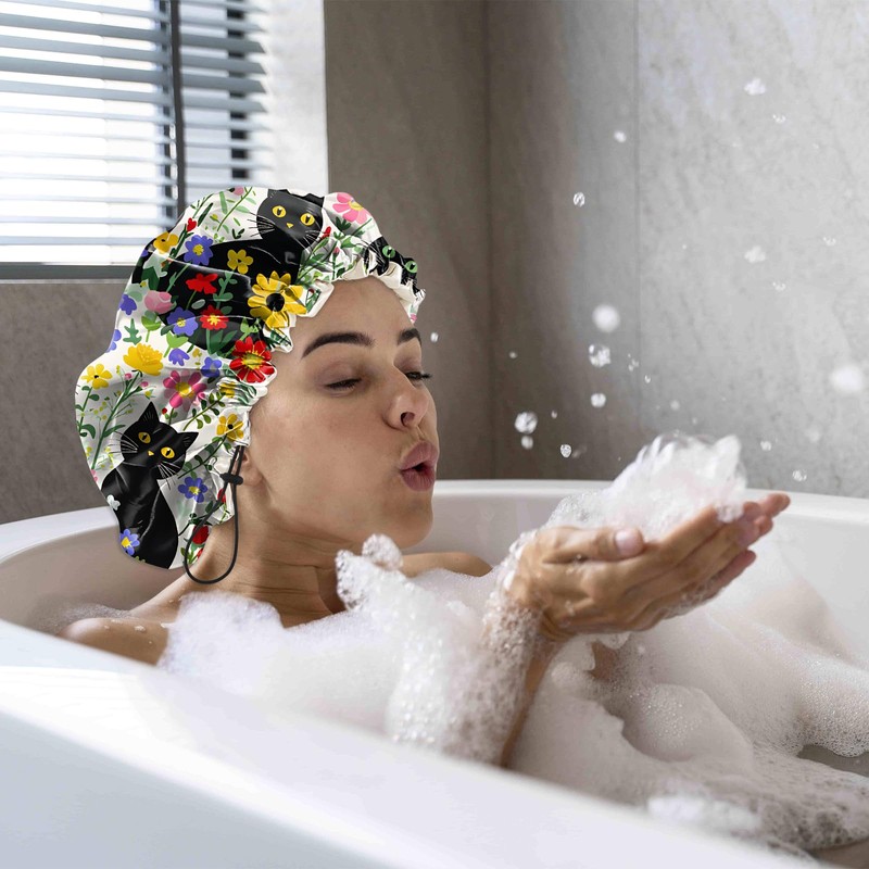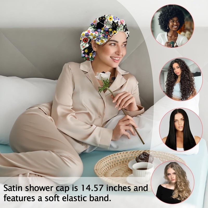 Cabreche Luxury Shower Cap Satin Silk Lined Adjustable Elastic Reusable Waterproof Shower Bath Cap Cute for Women Girls-Flower Black Cat