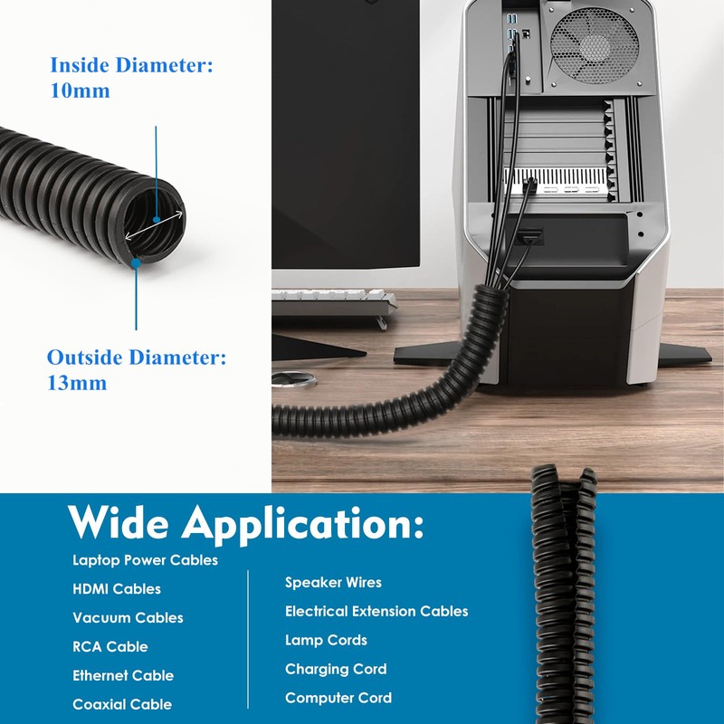 - 30 ft: With 30 Feet of split loom tubing, Size: 10×13mm (inner × outer diameter) you will have more than enough to cover cables and wires in your home, garden or perhaps in your office. You can cut this slit loom to any size and use for computer leads, Television cables and any other electronic device in and around your home.