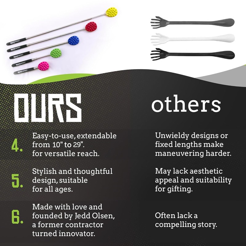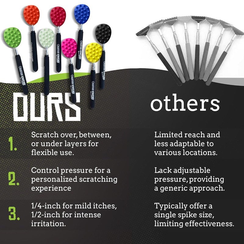 • Scratcher On A Big Stick: Don't strain your arm or contort your body to reach that pesky itch with our one-hand scratcher; The stick extends from 10 inches to an impressive 29 inches, giving you the reach you need to access even the most elusive spots on your back, shoulders, and beyond