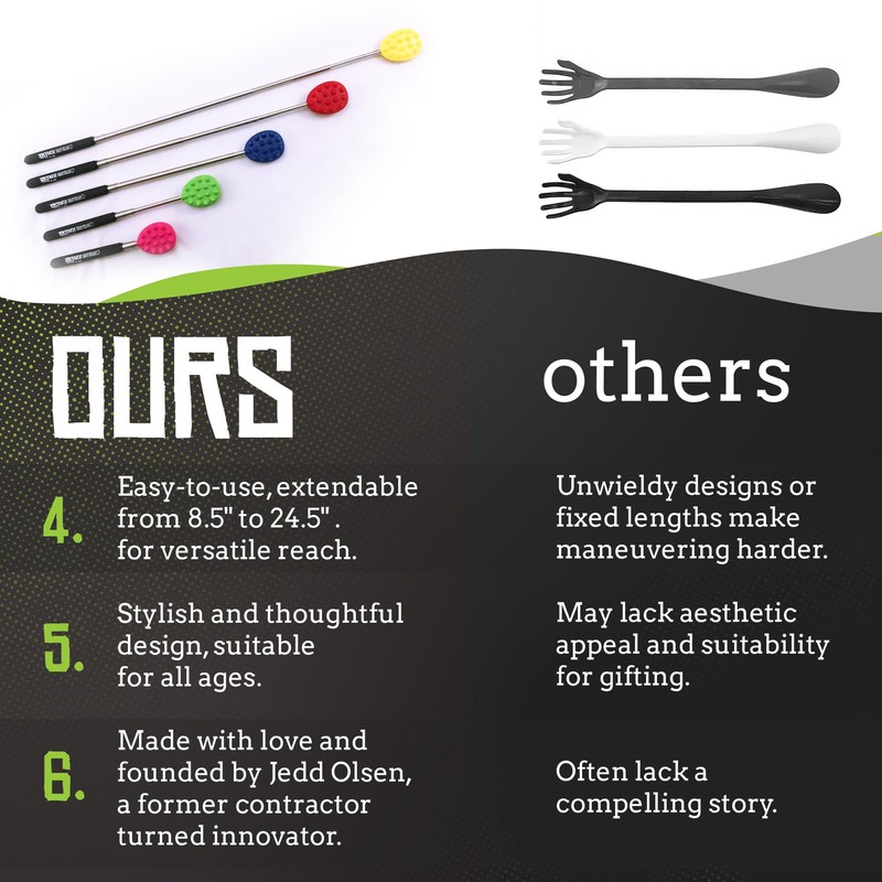 - VERSATILE SCRATCHER HEADS FOR CUSTOM RELIEF: Features compact back scracther tool design whether you need a sharp back scratcher for stubborn itches or a foot scratcher for targeted relief, we've got you covered.