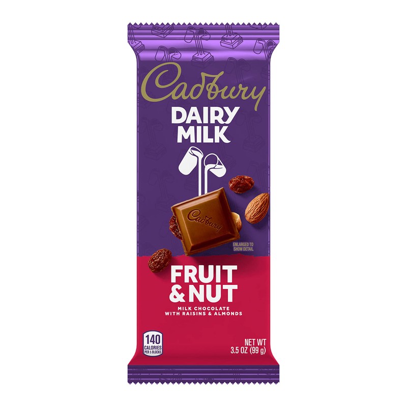 - Contains fourteen (14) 3.5-ounce CADBURY DAIRY MILK Fruit & Nut Milk Chocolate with Raisins and Almonds Candy Bars in a bulk case