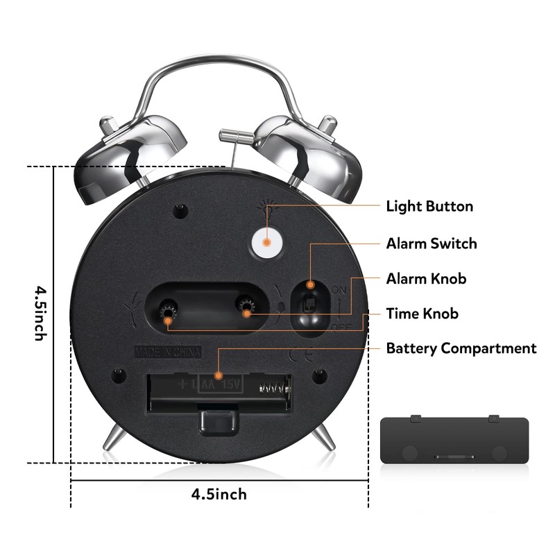 • Extra Loud Ringing: Features a twin bell design with a metal mini-hammer for a very loud ringing alarm that is perfect for heavy sleepers and those who have trouble waking up. There is no snooze option, ensuring you wake up on time