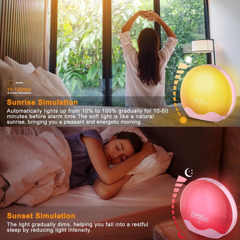 - 【Two-sided lighting with intelligent sunrise / sunset simulation】Sunrise Mode:10-60 minutes by gradually increasing the light from 10% to 100%;Sleep Mode: 10-120 minutes of sunset by slightly dimming the light from 100% to 0% when both lights and FM radio can be weakened or turned off separately. Natural sunrise sunset alarm clock to improve sleep, energy and well-being. The double-sided lighting design ensures even, areal lighting.
