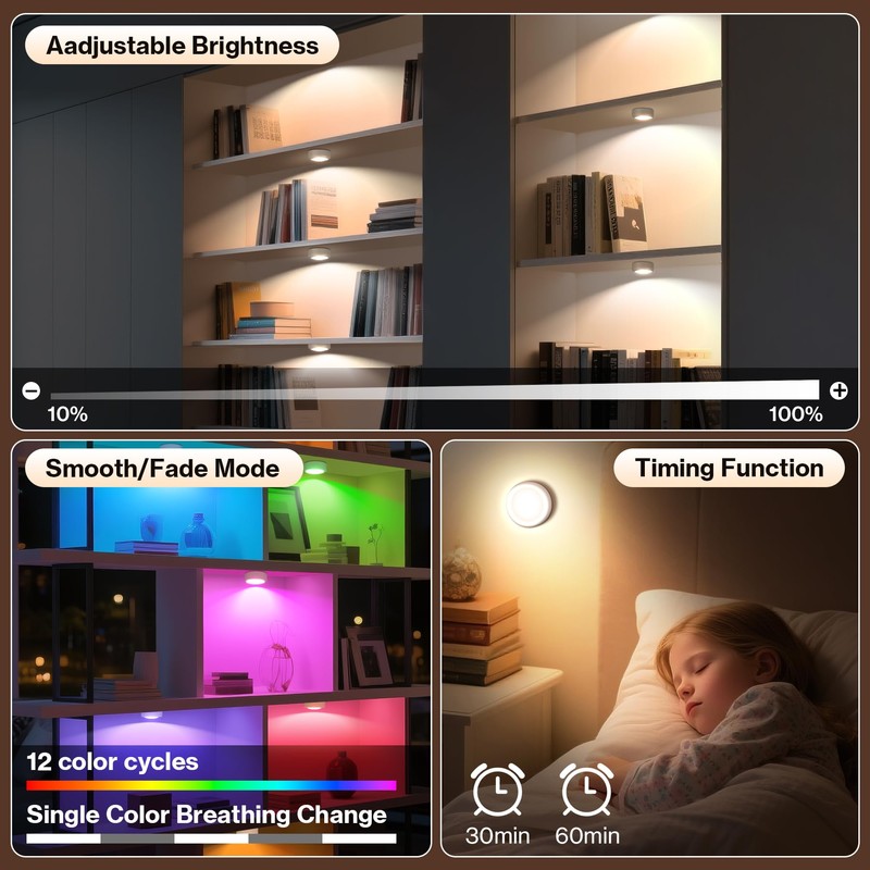 • 【Touch Control & Timer Setting】There are two control methods: touch and remote control. A short touch turns the light on/off and changes colors. A long touch adjusts the brightness (brighter or dimmer). The remote control features a timer function, allowing you to set the puck light to turn off automatically after 30 or 60 minutes.