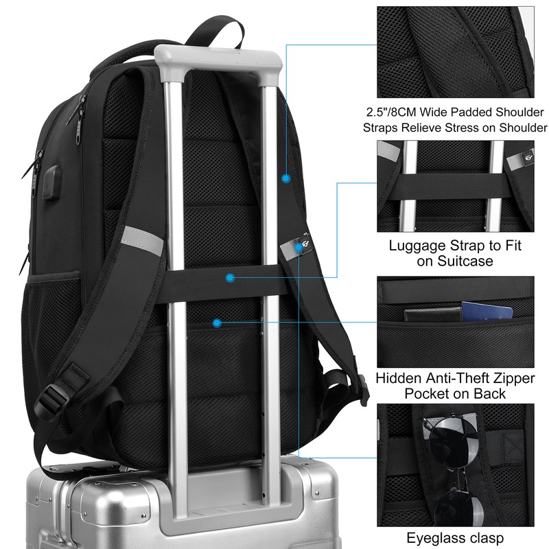 - 【TSA APPROVED & LUGGAGE SLEEVE】At checkpoint,Unfolds the smart laptop backpack freely 90-180 degree making you quickly through the airport security and keep items tidy,exclusive designed for flight travel.This tech backpack fits under seat on an airplane.A luggage strap on the back allows the travelling backpack to be fitted on luggage/suitcase,slide over the luggage upright handle tube for easier carrying.Serve as a extra large durable backpack for travel,large bookbag for boys girls teens.