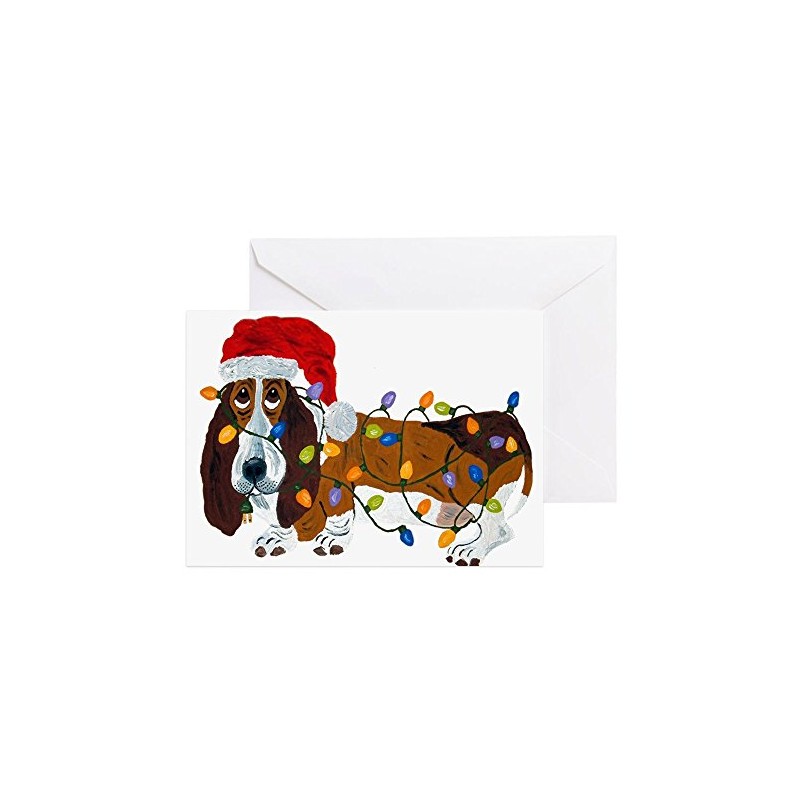 CafePress Basset Tangled In Christmas Lights Greeting Cards Folded Greeting Card Matte