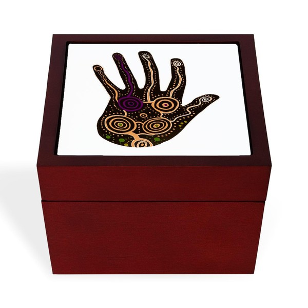 - FEATURES: Cherry wood finish with hinged cover, tile insert, and soft black felt lining.
