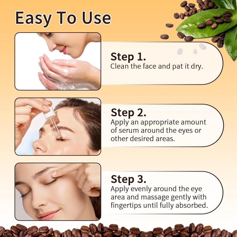 Caffeine serum contains natural ingredients such as caffeine, glycerin, green tea extract and water. The serum is light and non greasy, easy to absorb, which provide ample moisture to the skin, relieving dry skin and improving skin elasticity.