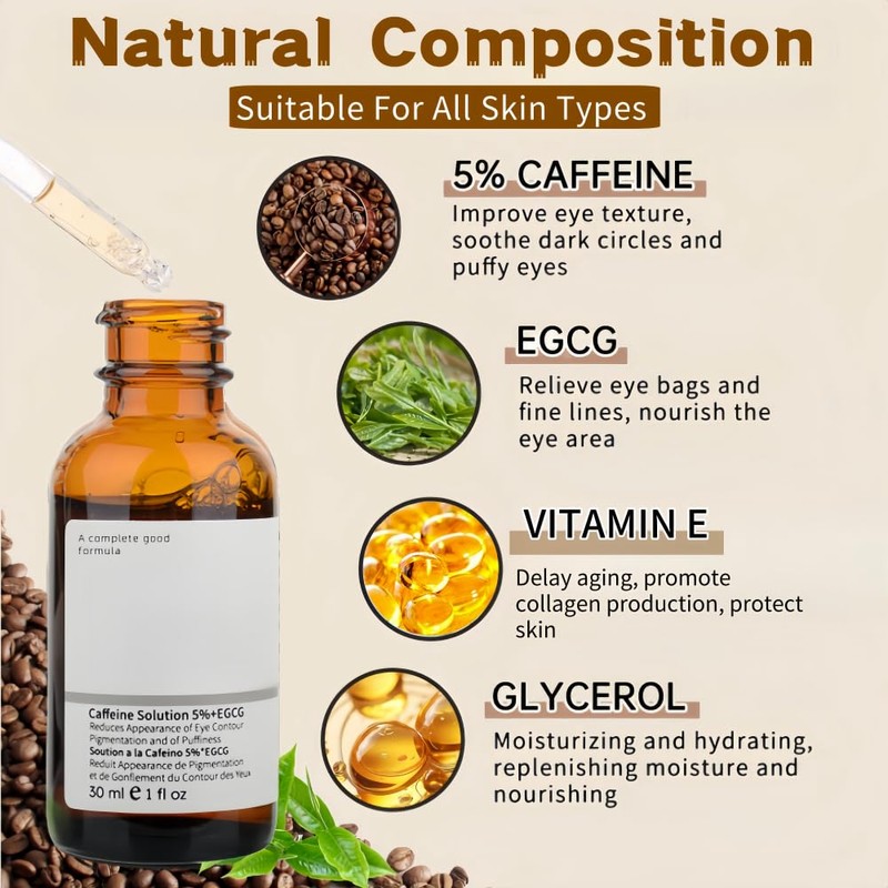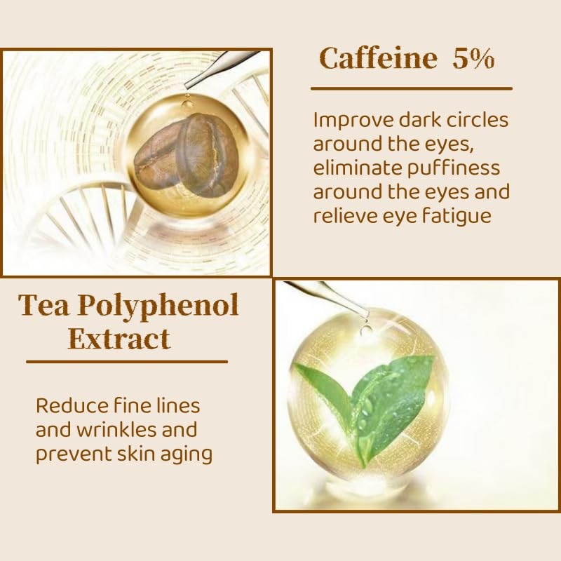 - Natural Caffeine Essence: Caffeine eye essence is rich in natural ingredients such as caffeine, glycerin, water, and Asiaticum, which is gentle and friendly to the eyes and helps to improve eye skin problems.