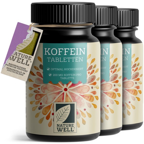 The NatureWell caffeine tablets are optimally high dose and provide the same amount of caffeine as 2-3 cups of coffee with 200 mg of caffeine. The caffeine is present in the tablets in a highly pure form - this means that it can be absorbed and used significantly quickly by the body as caffeine from ordinary foods such as coffee or tea. The caffeine tablets have a small shape and can therefore be easily taken with a glass of water. Thanks to a predetermined breaking edge, the tablets can be easily divided in the middle, which allows the supply of only 100 mg of caffeine.