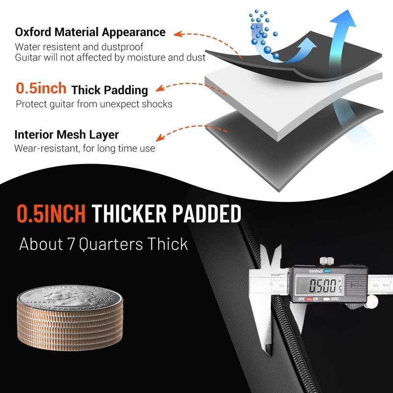 - 0.5-inch thick sponge padding. Padding is thicker than previous version and will protect your guitar from bumps and scratches.