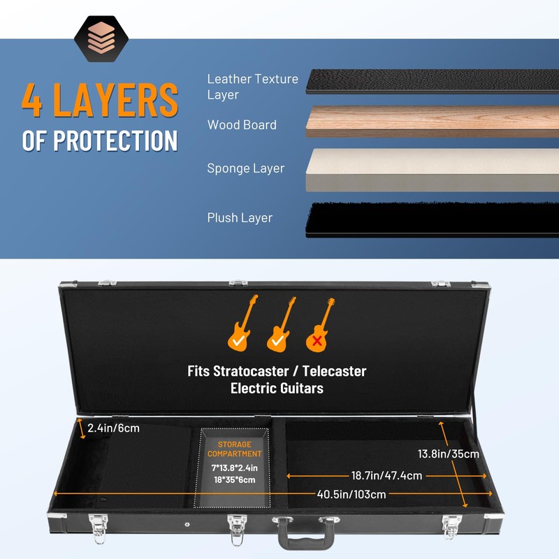 - Spacious Interior Storage Compartment: interior accessory storage compartment with Lid is fully padded inside & out, interior dimension 13.8x7x2.4” (LxWxH) and is large enough to hold tuner, picks, guitar straps, audio cables, extra strings and other essentials.