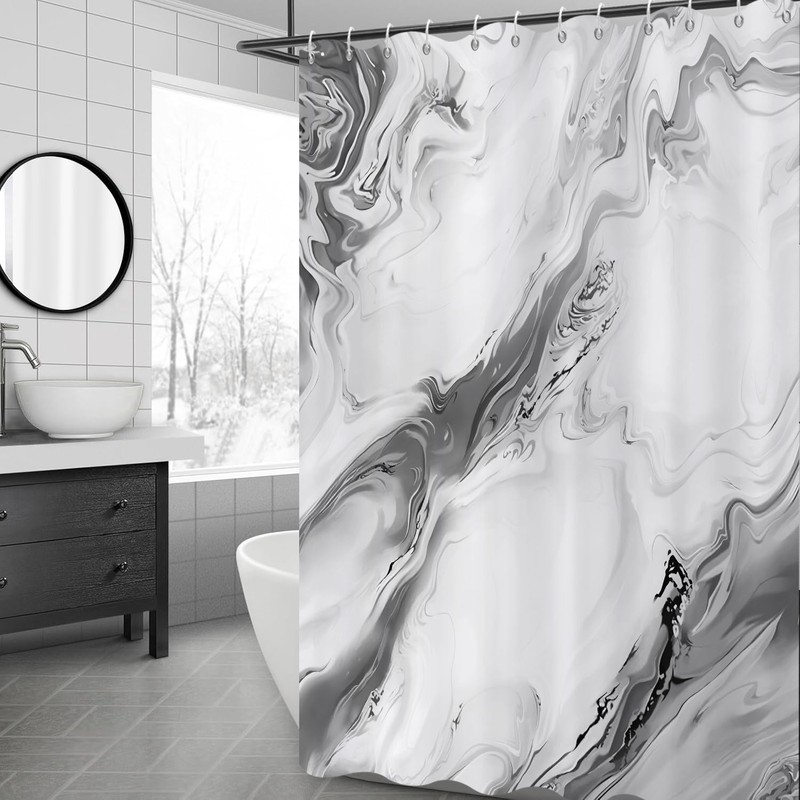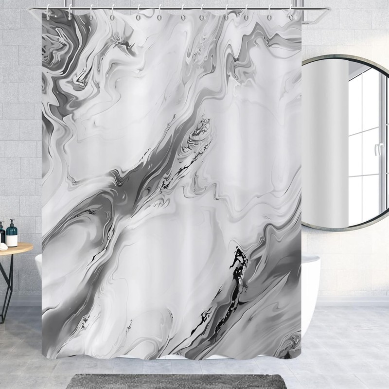 This abstract grey marble shower curtain set comes in 1 pc shower curtain and plastic hooks.