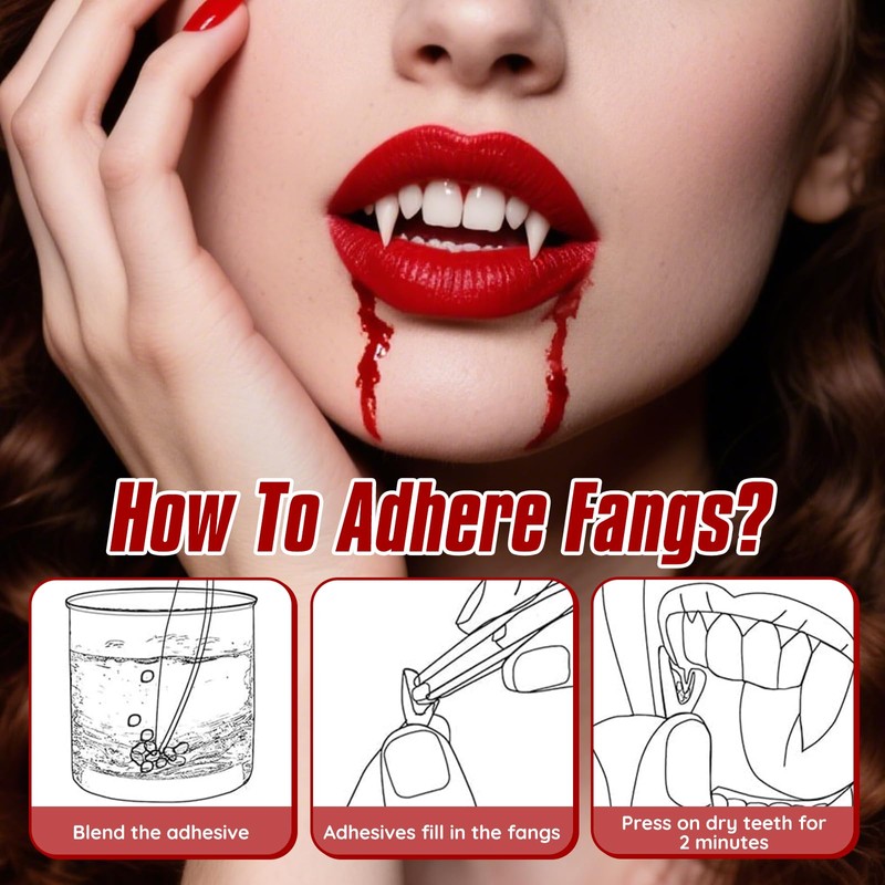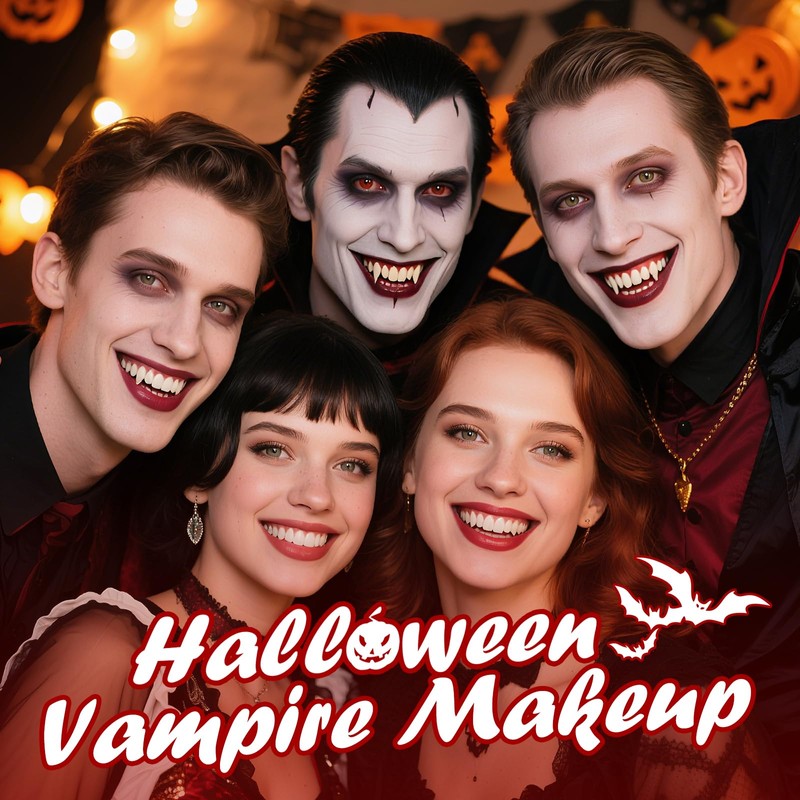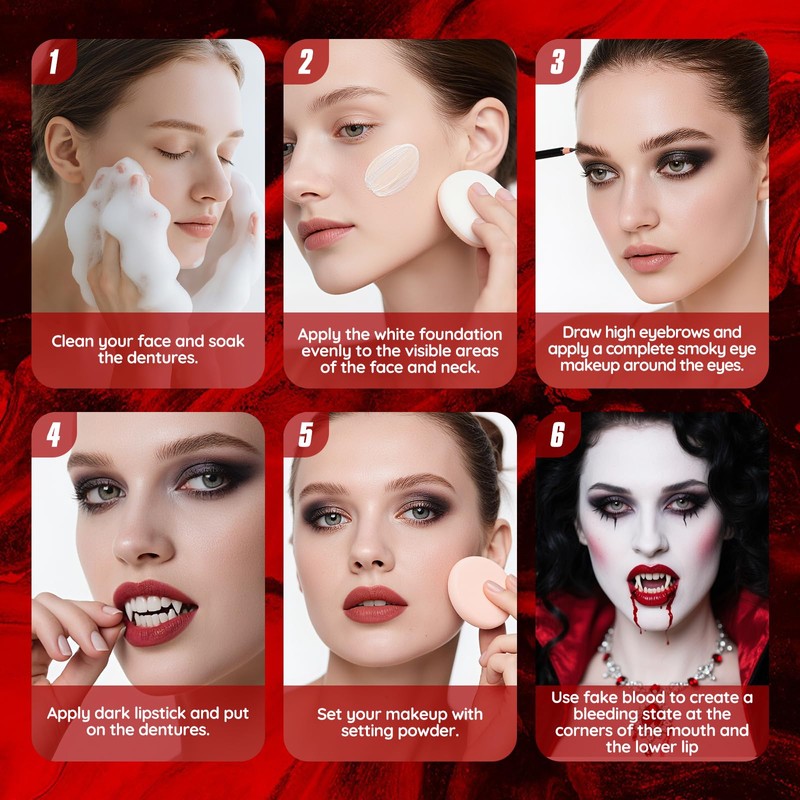 - Simple makeup application steps: Step 1: Clean your face and soak the dentures. Step 2: Apply the white foundation evenly to the visible areas of the face and neck. Step 3: Draw high eyebrows and apply a complete smoky eye makeup around the eyes. Step 4: Apply dark lipstick. Step 5: Put on the dentures. Step 5: Set your makeup with setting powder. Step 6: Use fake blood to create a bleeding state at the corners of the mouth and the lower lip