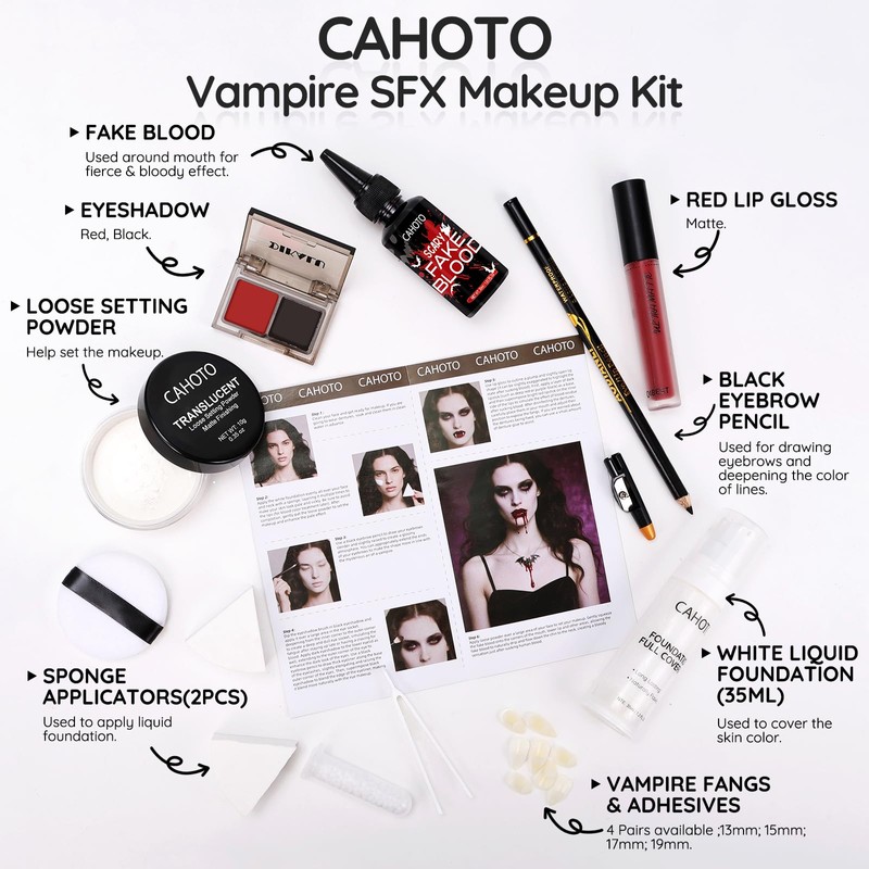 - Halloween Vampire SFX Makeup Kit: This vampire makeup set includes: white foundation, loose powder, eyebrow pencil, artificial blood, dark style eyeshadow, four pairs of dentures, denture gel to match the dentures, a red lip gloss, and a detailed instruction manual to guide you in creating another realistic dark vampire-style special effect makeup