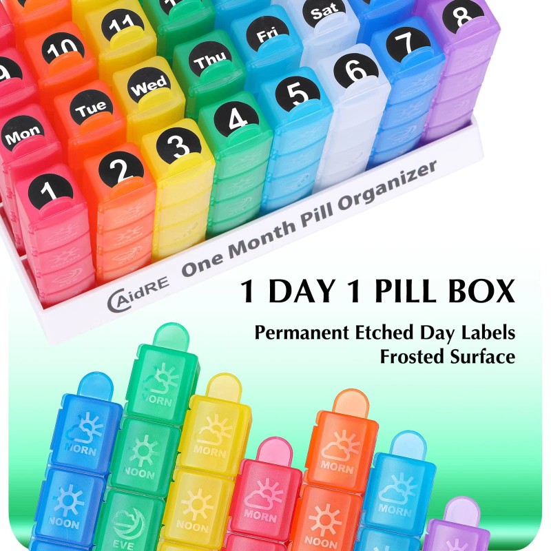 🌈[ MorN-NooN-EvE-BeD Daily Compartments ] : The CAidRE Monthly Pill Organizer features 32 numbered multicolored translucent compartments that allow you to use a numbered daily pill box each day according to your monthly pills plan.The lid of each detachable daily pill box is clearly engraved with morning-noon- night patterns & letters to help you save planning and medication time very day or month.