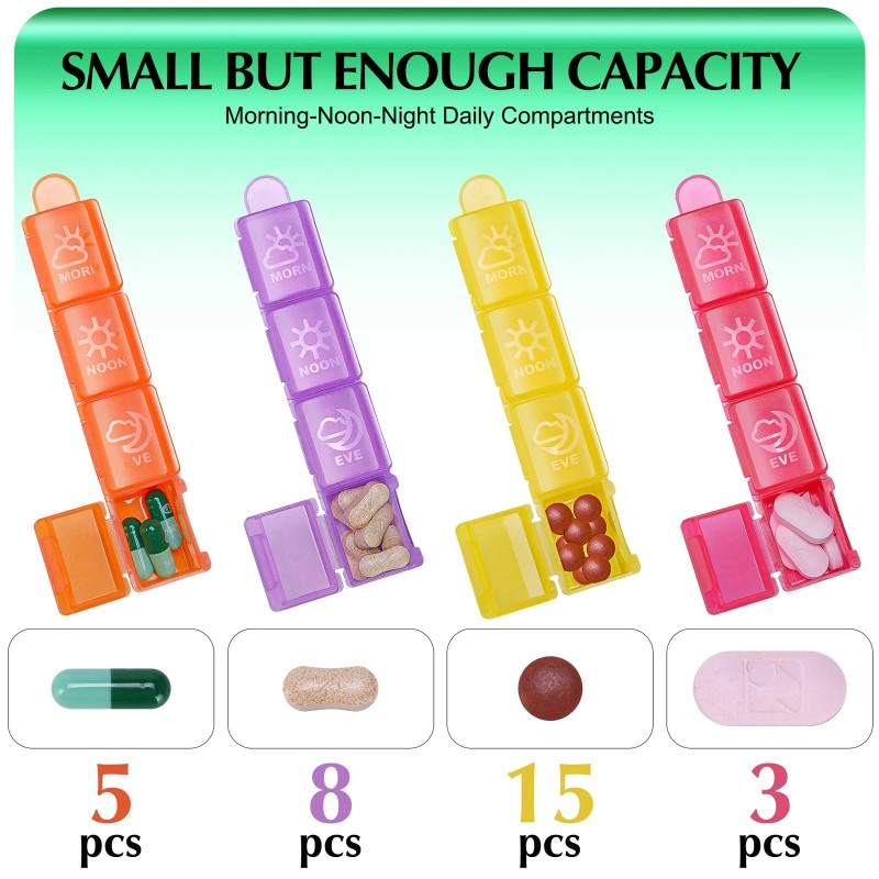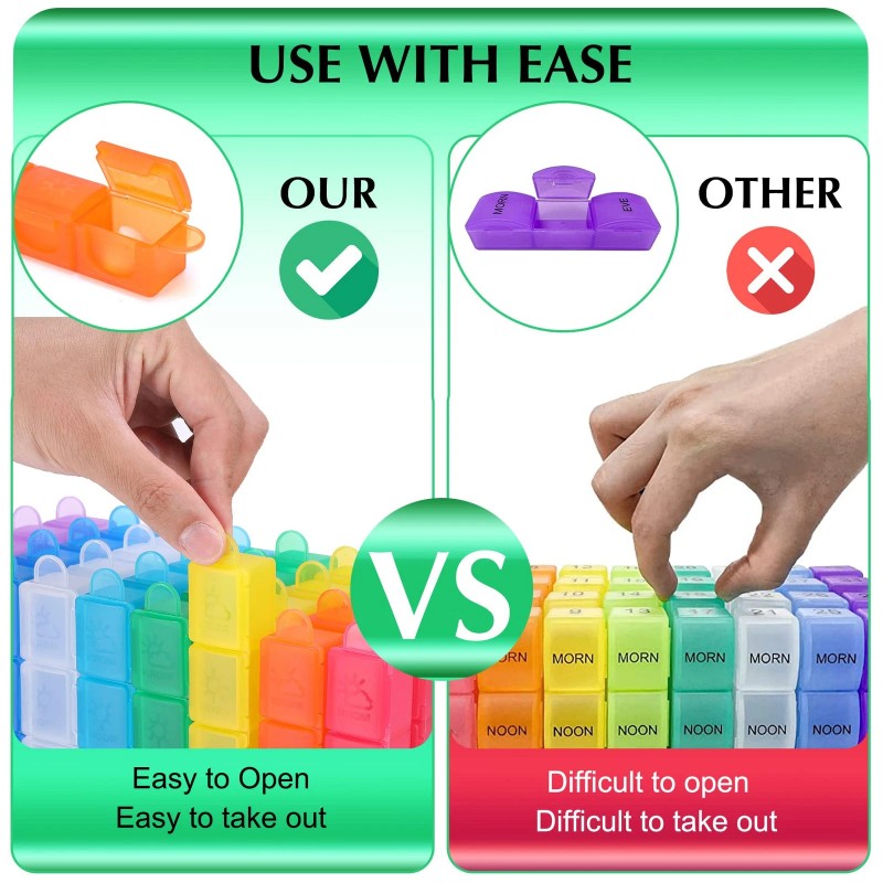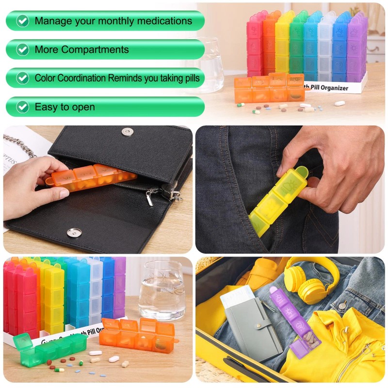 🌈[ Easy to Store ] : This monthly pill organizer has 32 individual compartments, you can easily sort and fill your pills for one month in advance! Whether you take your pills by day, by week or by month, this pill box organizer 4 times a day with enough capacity storage can meet all your needs.