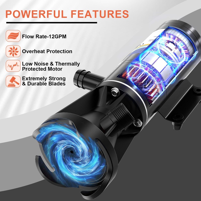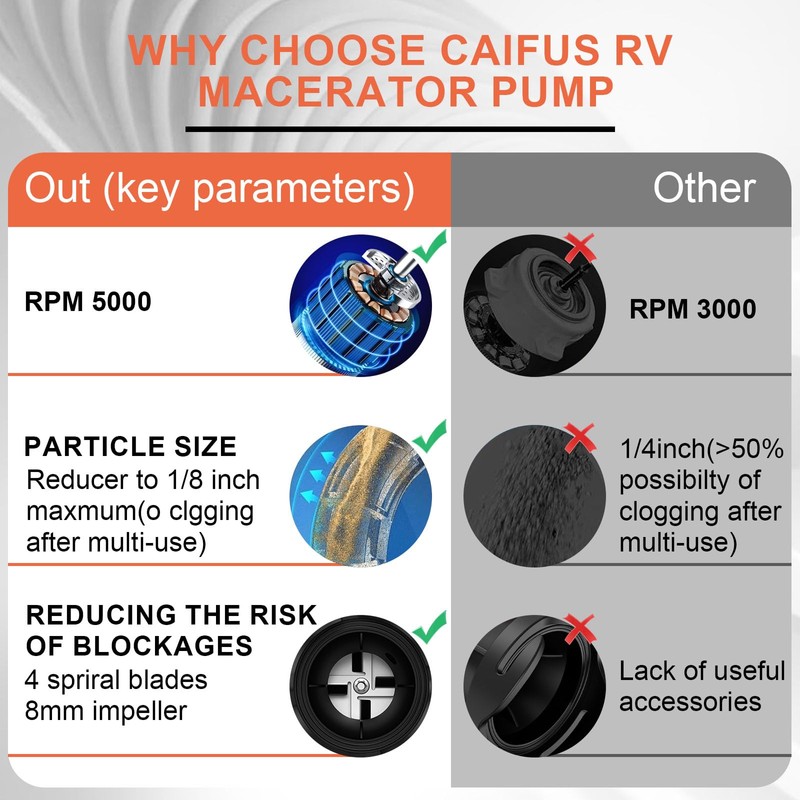- Durable and Powerful: This RV macerator pump is made of durable, corrosion-resistant materials with 4 high-precision spiral blades and an 8mm impeller, which crushes waste solids into fine particles, greatly reducing the time it takes to clean up your RV's daily wastewater, and making every trip cleaner and more convenient for you.