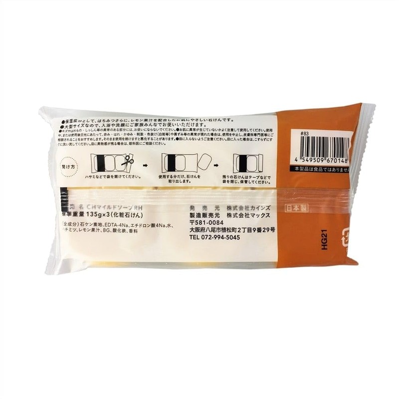 - ■ Features: ● Moisturizing ingredients with honey and lemon juice, gentle on the skin. The large size makes it suitable for the whole family to take a bath or wash face. ■ Country of Origin: Japan ■ Contents: 135 g x 3 ■ Quantity: 3 ■ Ingredients: Istone Kenza, EDTA-4Na, 4Na, Ethidoronic Acid, Water, Honey, Lemon Juice, BG, Iron Oxide, Fragrance