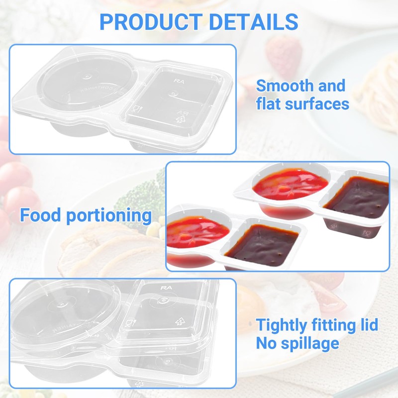 The transparent and portable snack boxes are the ideal snack and spice jar with two compartments. Each box has two separate compartments to ensure spices, condiments or different foods are stored separately so that the flavors do not mix and retain the original taste. The airtight lid prevents leaks and ensures that the food is kept clean and tidy on the go, making it ideal for preparing meals, dips or snacks. The light weight and compact size make it ideal for home, travel, picnics or outdoor activities. So you can take spices, snacks or craft material anywhere.