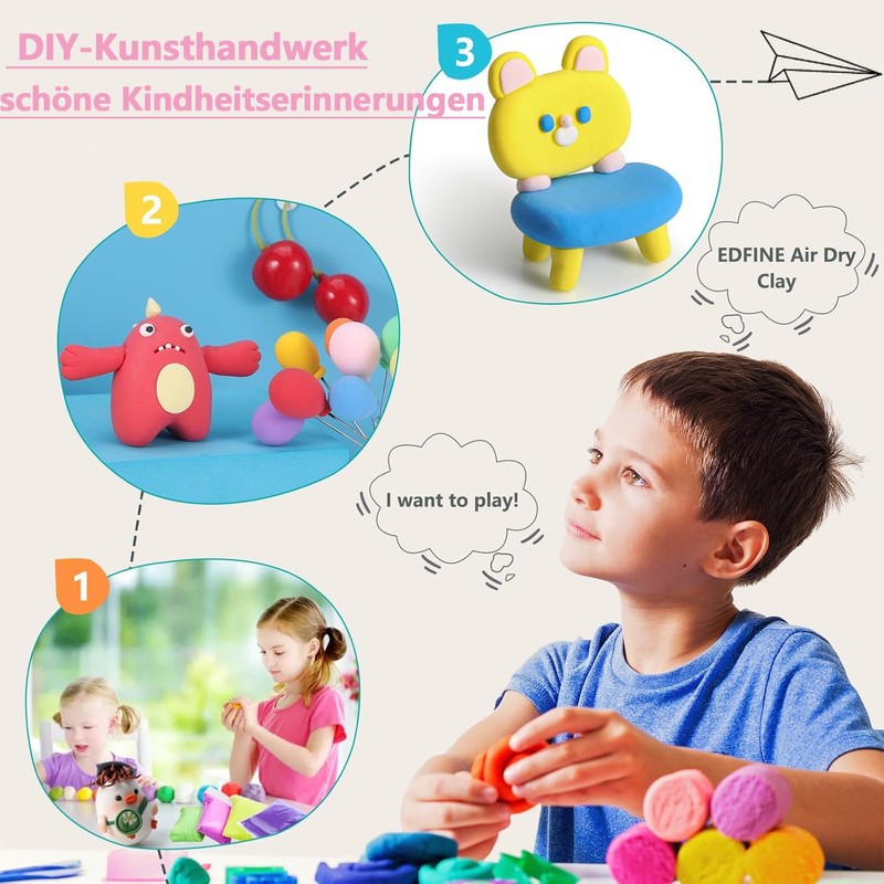 - Children's clay: Our craft air-drying modelling clay is non-toxic and environmentally friendly, soft, ultra-light and stretchy. The air-dry clay set is available in 36 different colours. You can combine it as you like to get exactly the colour you have imagined.