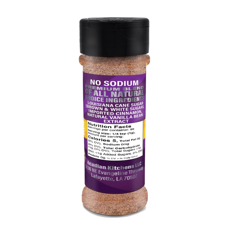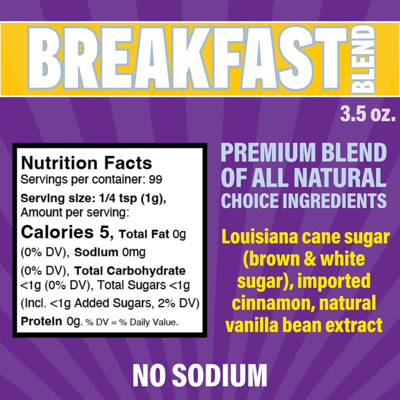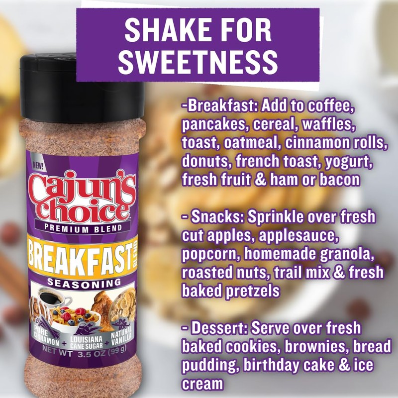 • Cajun's Choice Breakfast Blend Seasoning is a deliciously sweet premium blend of Louisiana Cane Sugar, Pure Ground Cinnamon and Natural Vanilla Extracts. No Sodium. No Heat, All Sweet. All Natural, Choice Ingredients.