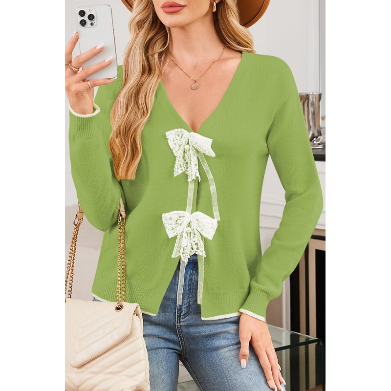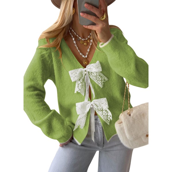 Cakulo Womens Bow Sweater Tie Front V Neck Cardigan Sweaters Lightweight Knit Fall Cardigans Crop Tops 2025 Green M