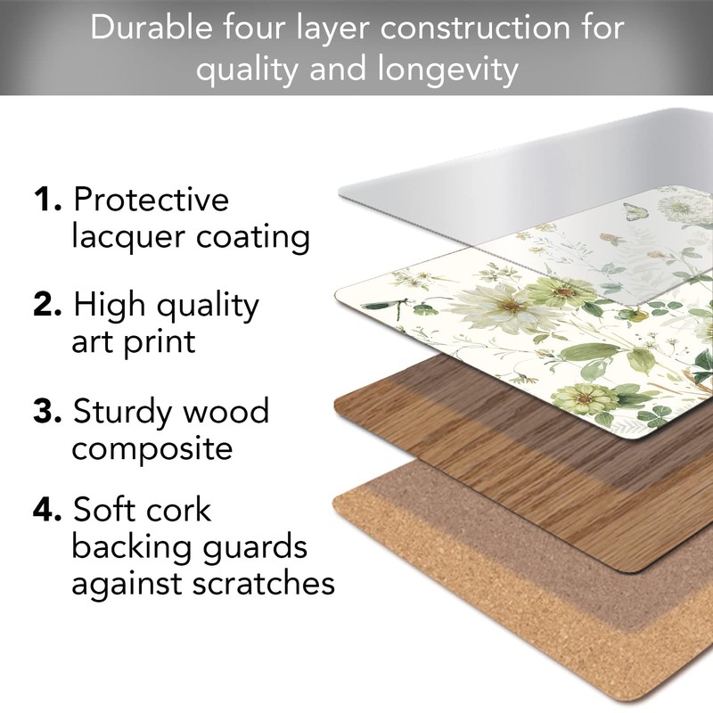 - LAYERED CONSTRUCTION- Made with a layered construction. The surface of the mats is coated with protective lacquer. Heat resistant to 212 degrees Fahrenheit. The art is laminated to a wood composite layer. A soft cork backing protects the table surface from scratches.