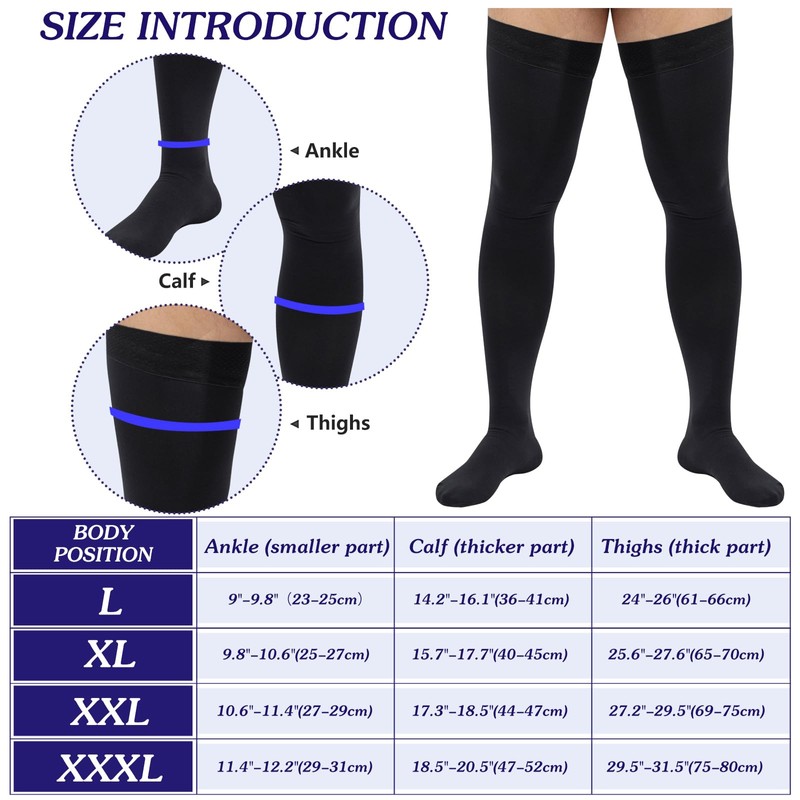 - Talla XL y altura del muslo: nuestros calcetines de compresión alta hasta el muslo con compresión graduada de 23-32 mmhg. Promueve la fatiga y el alivio de las molestias a través de la presión sobre los músculos.