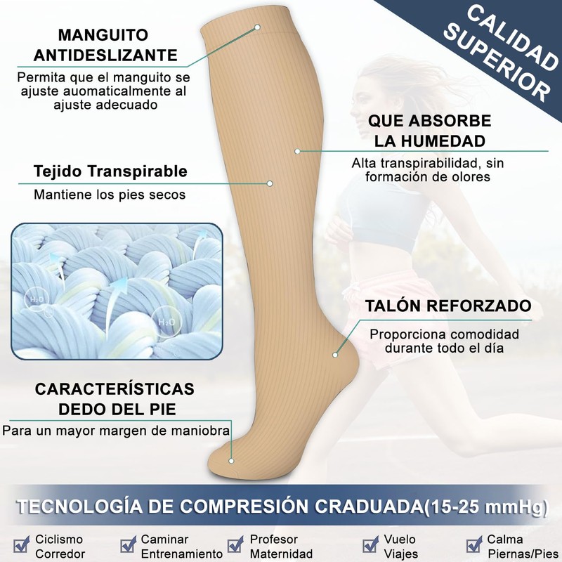 - Elección para Más Ocasiones: Medias de compresion deportivos son perfectos para las personas sedentarias, que permanecen de pie durante largos periodos de tiempo o que hacen ejercicio con regularidad. Cuando se es sedentario, previenen las pequeñas varices y alivian la fatiga de las piernas; cuando se hace ejercicio, ayudan a que las piernas se recuperen más rápidamente y previenen las lesiones