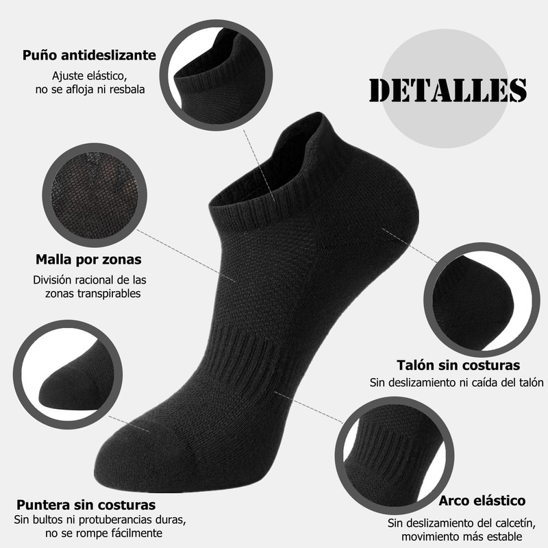 - 🚴♀️ Cómodos, suaves y transpirables: Estos calcetines deportivos cortos están fabricados en materiales transpirables con zonas de ventilación, que mantendrán tus pies frescos y secos durante todo el día. Las zonas antifricción en el área del talón y la punta evitarán la aparición de rozaduras durante los entrenamientos más intensos.