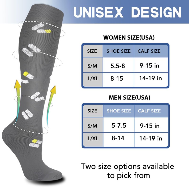 - Reduce lesiones: proporciona una compresión suave para mayor calidez y mejora el movimiento de la sangre a través de tus piernas. Elimina el estrés y estimula cada célula, alivia los síntomas de las venas varicosas y el exceso de retención de líquido. Ayuda a aliviar el dolor y las molestias relacionadas con la fascitis plantar, proporciona una verdadera compresión graduada para apoyar tus piernas, reducir la fatiga, el dolor, los calambres y prevenir lesiones al mismo tiempo.