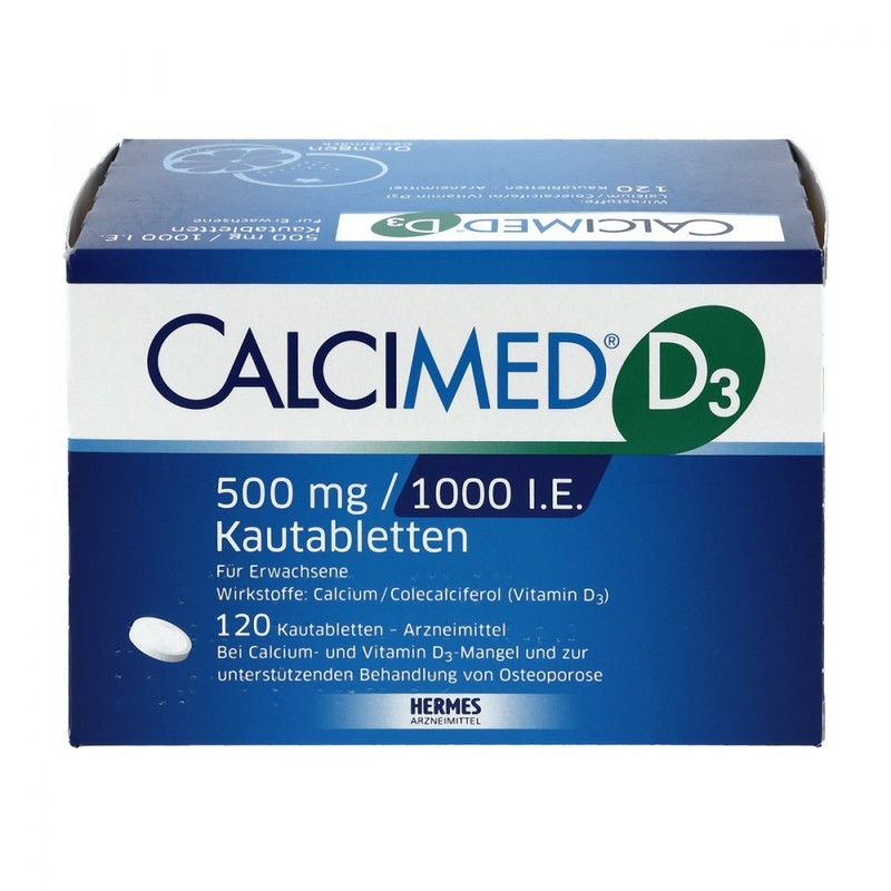 CALCIMED D3 500 MG / 1000 IU Chew tablets. Areas of application: for the prophylaxis and treatment of calcium and vitamin D deficiency in older people; as calcium and vitamin D supplement to support the treatment of osteoporosis (bone loss). Warning: contains aspartame, sorbitol, isomalt and sucrose (sugar).