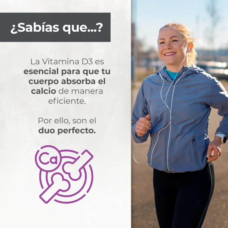 - La Vitamina D3 es absolutamente indispensable para la correcta absorción del calcio en el intestino y su posterior fijación en los huesos. Sin suficiente Vitamina D3, incluso el calcio que consumes no se utiliza de manera eficiente.