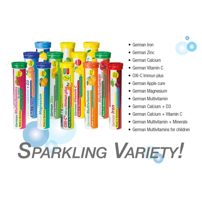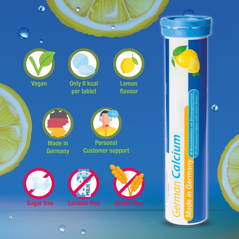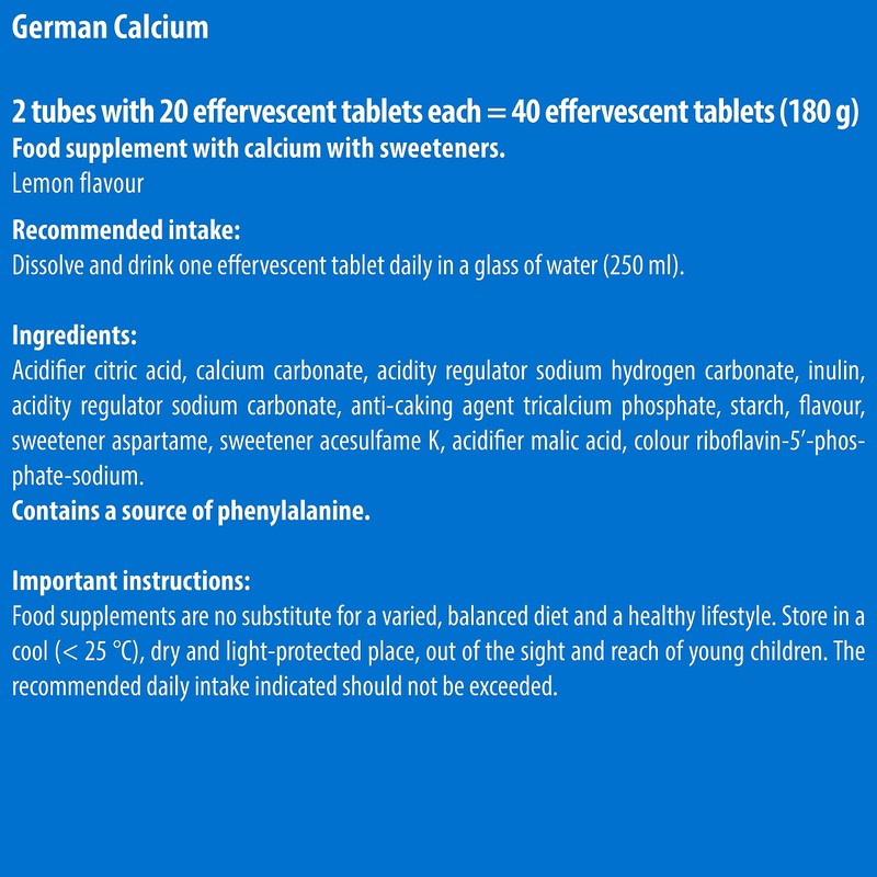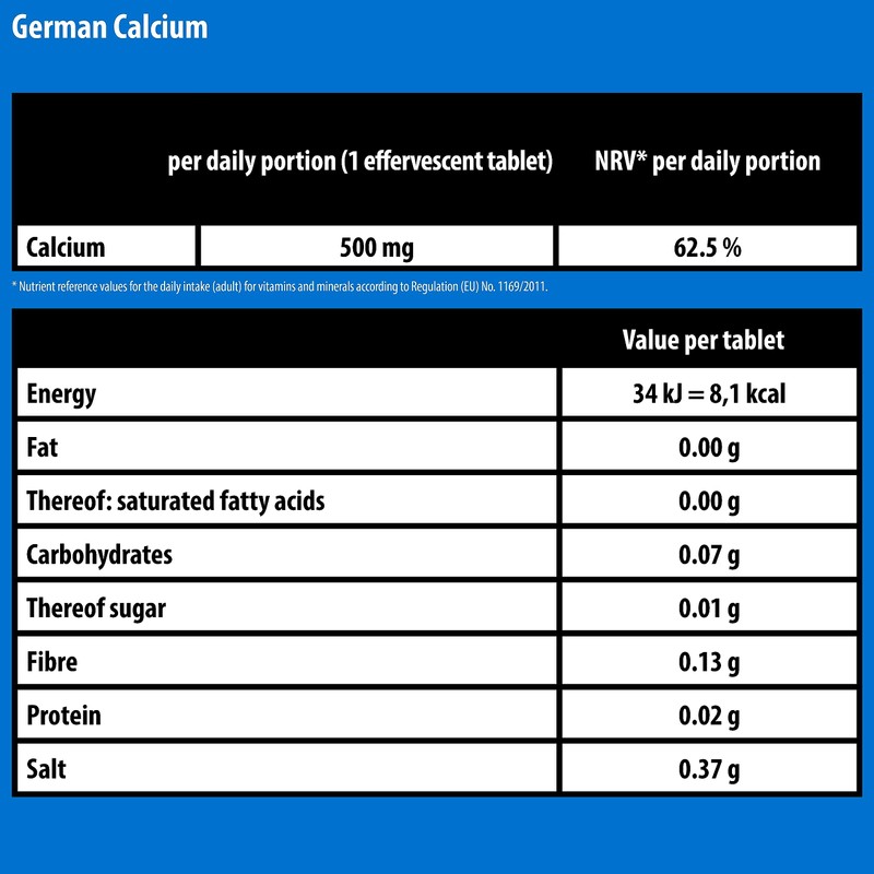 In these cases, in order to close the supply gap an additional supply of calcium is strongly recommended. It is precisely for this purpose that our nutritionists have developed German Calcium effervescent tablets. With 500 mg calcium, thy provide the much-needed extra in calcium. Sensibly dosed in order to guarantee the calcium supply even with low consumption of milk and dairy products – and at the same time only enough calcium so that there is no overdosing.