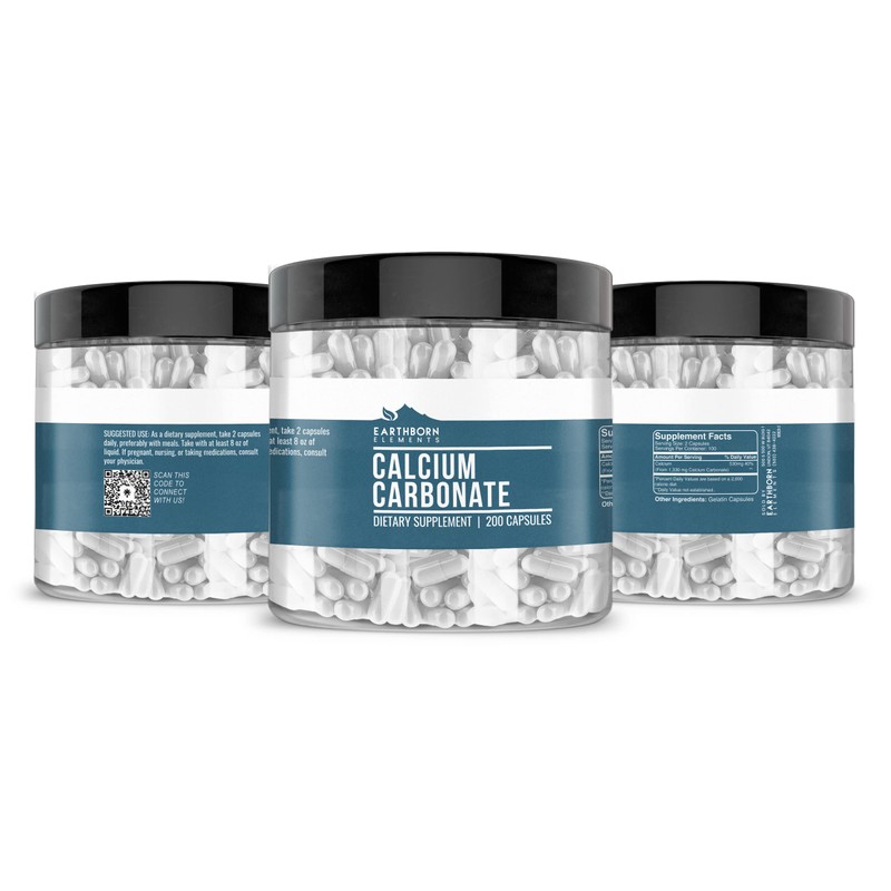 **Earthborn Elements Calcium Carbonate Supplements** Build Strong Bones, Reduce the Risk of Osteoporosis, Strengthen Teeth, & are a Natural Antacid.* Each Serving of Our Calcium Carbonate Contains 1,100 mg. of Calcium, 110% recommended Daily Value. **BETTER HEALTH:** i. Supports Nerve, Heart, & Muscle Health* ii. Reduces the Risk of Osteoporosis.* iii. Builds & Supports Strong Bones.* iv. Strengthens Teeth.* v. Natural Antacid.* **100% PURE:** i. Free from Soy, Dairy, Yeast, Sugar, and Gluten. ii. No Chemicals, Preservatives, Artificial Color, or Flavor. iii. Food and USP Pharmaceutical Grade. **Suggested Use:** Take 2 capsules daily, preferably with meals, or as directed by your healthcare professional. **Ingredients:** 1,100 mg Calcium per Serving. **100% MONEY BACK GUARANTEE:** We are confident that you'll love our products and stand behind every single item with a 100% satisfaction guarantee. If you are not satisfied with your purchase return the product for a full refund. ***These statements have not been evaluated by the Food and Drug Administration. This supplement is not intended to diagnose, treat, or cure any disease.** WARNING: Consult your healthcare professional before using this or any dietary supplement. USE WITHIN 2 YEARS OF PURCHASE DATE