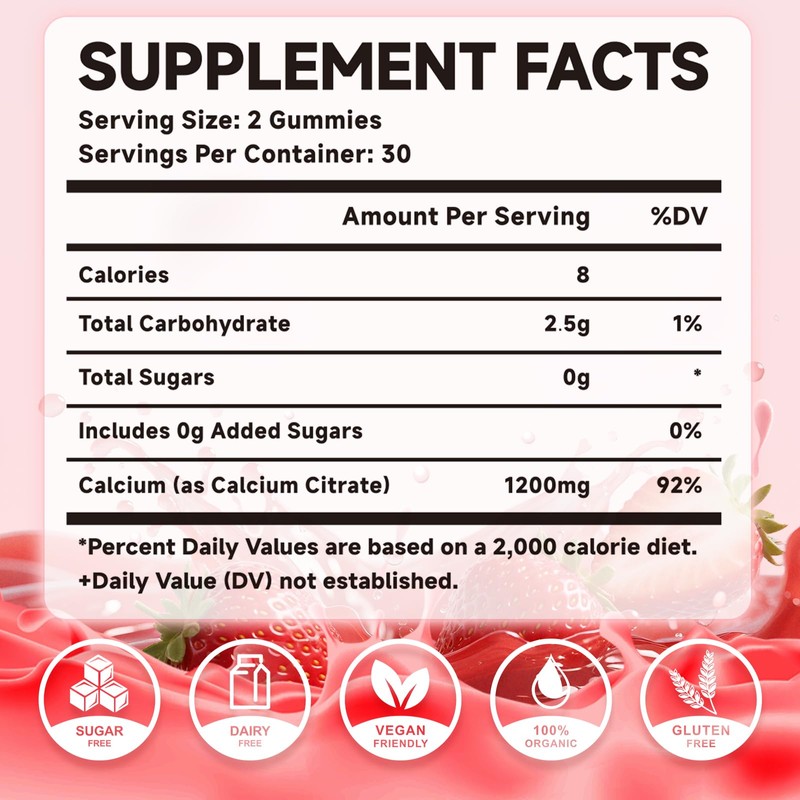 - Convenient & Tasty: Our calcium supplements boast a natural strawberry flavor, turning your supplement routine into a treat. Skip the hassle of swallowing tablets or capsules—these chewable calcium gummies fit seamlessly into your day, making consistency simple