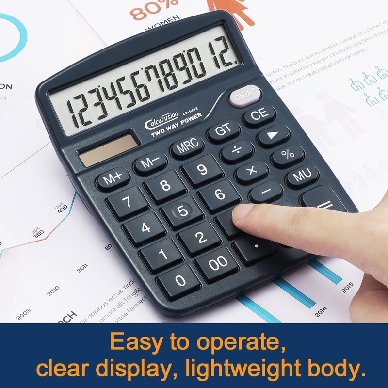 CALCUFUSION 12 Digits Desk Calculator with Large Display LCD and Sensitive Big Buttons Dual Power Solar Calculator with Battery Standard Functions Basic Calculators for Offices Home Schools CF-1453