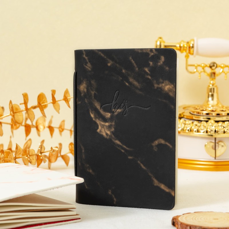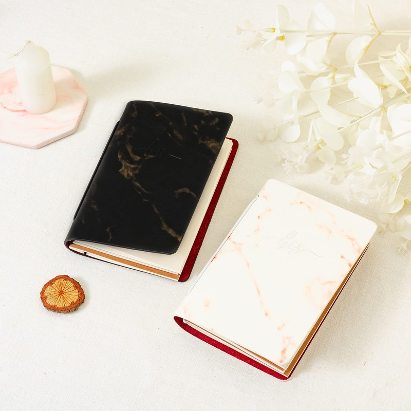 Calculs Handcrafted Wedding Vow Books Set of 2 Black & White Authentic Cowhide Cover with His and Her Stamping Marble