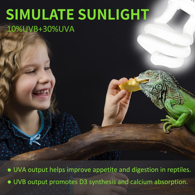 The reptile UVB lamp provides an ideal environment for reptiles by providing them with the light of natural sunlight. UVB promotes the synthesis of vitamin D3 and the absorption of calcium, helping home reptiles grow healthy. UVA helps to increase the appetite of the reptile and promotes digestion of food.