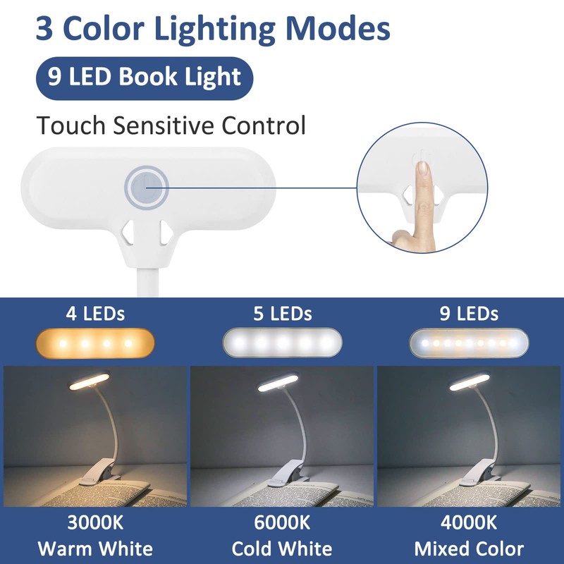 - Augenschutz und 3 FarbtemperaturenDie Buchlampe hat eine Nennlebensdauer von 50.000 Stunden und verfgt ber 3 Beleuchtungsmodi: 4 warme LEDs (3000K), 5 khle LEDs (6000K) und 9 gemischte warme und khle LEDs (4000K). Berhren Sie einfach die Taste oben an der Buchlampe, um einfach zwischen den Beleuchtungsmodi zu wechseln, die fr verschiedene Leseumgebungen geeignet sind. Die Augenschutz-Buchlampe bietet stabiles und angenehmes Licht, um unsere Augen zu schtzen.