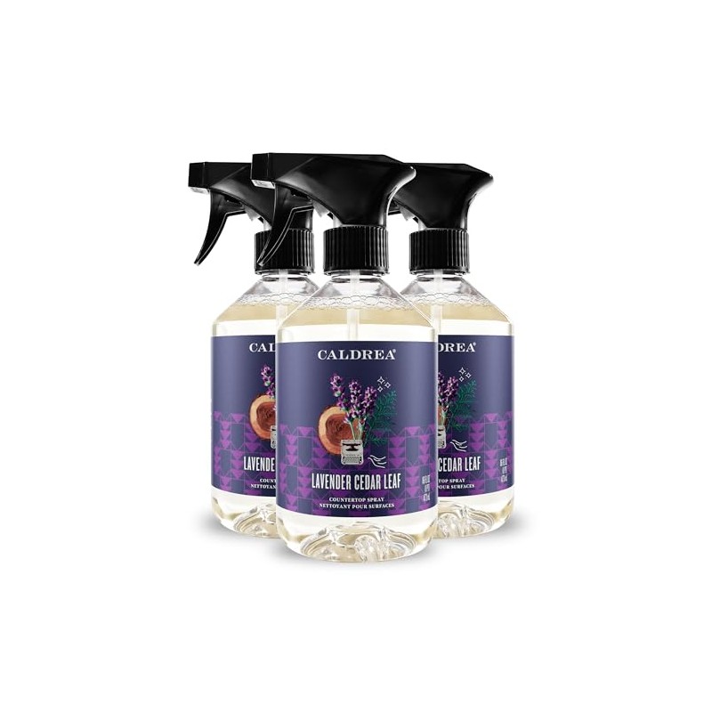 Caldrea Lavender cedar leaf counter top Spray surface cleaner refreshes home and mind with Little effort. Simply spray and wipe clean. Basil, Lemon, lavender, Spearmint and sage top notes leave you wanting more, while Basil, sage, Thyme, spearmint and rosemary essential oils create an intricate, harmonious fragrance. This surface cleaner uses a special Vegetable Protein Extract to quickly remove odors. Safe, hardworking and effective on all non-porous surfaces including natural stone, it makes a great addition to all cleaning supplies.