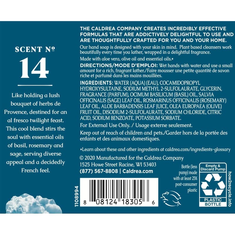 Caldrea Hand Wash Soap, Aloe Vera Gel, Olive Oil and Essential Oils to Cleanse and Condition, Basil Blue Sage Scent, 10.8 oz (Packaging May Vary)