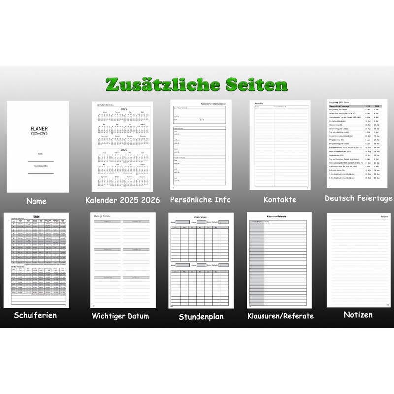 • Planner 2025 2026 ring binder, from August 25 to Jul.26 - weekly plan, 1 week 2 pages, monthly plan with tabs. Extra notes, contact, holidays, timetable and exam tracker, important dates, habit tracker, calendar 2025 2026 overview.